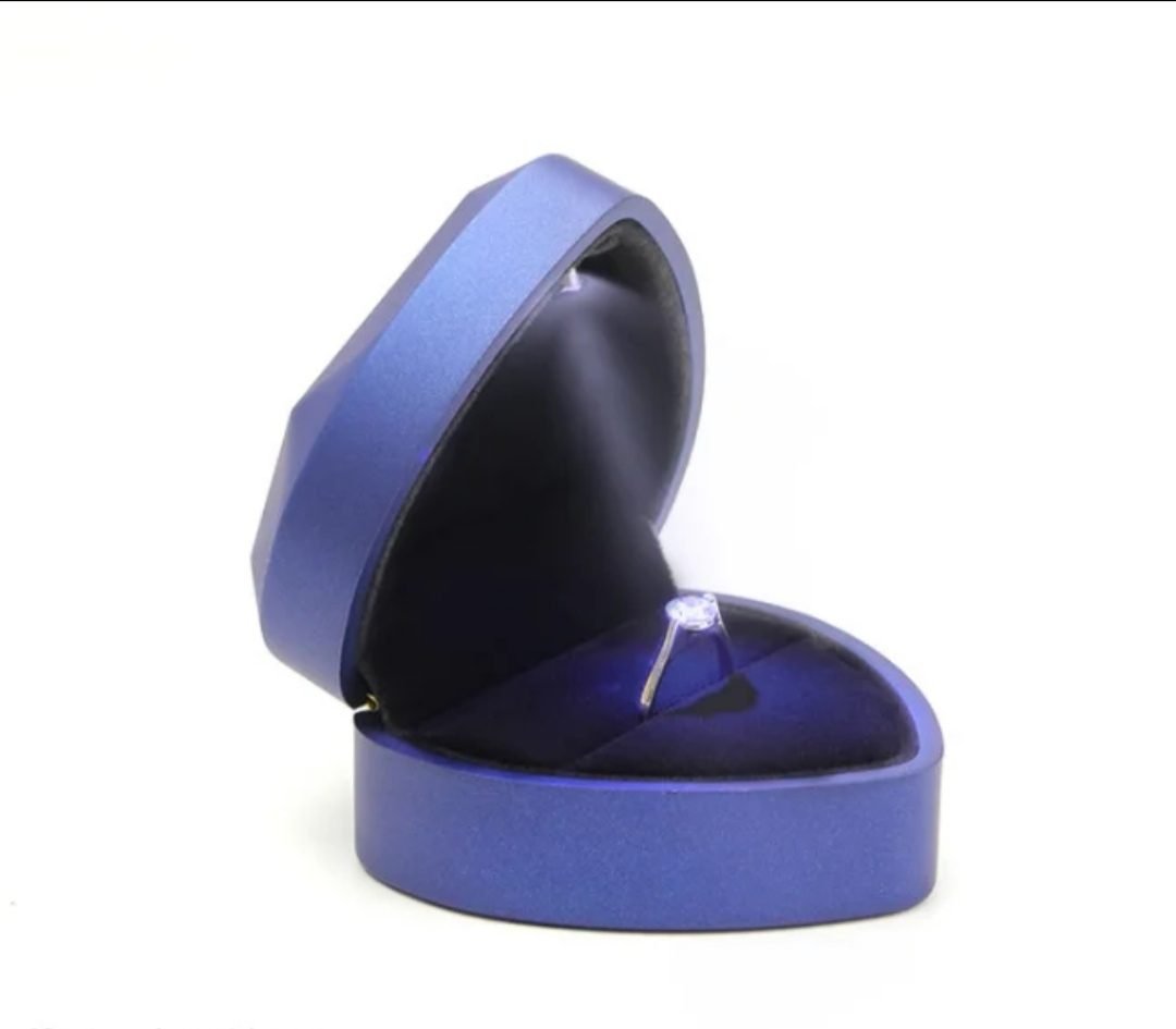 Caja azul de terciopelo con luz LED, diseñada para realzar el brillo de anillos de promesa, compromiso o matrimonio