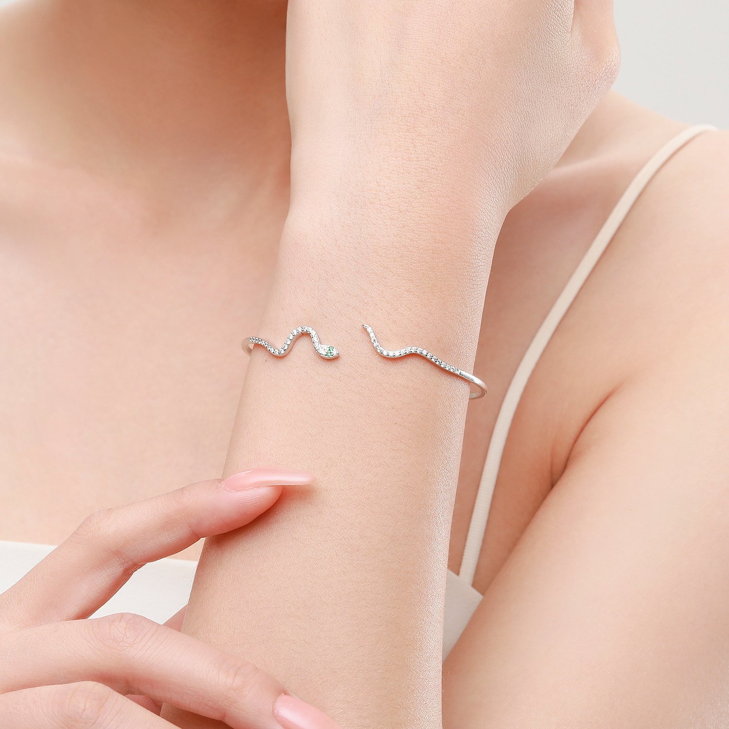 Pulsera en plata ley 925 con diseño de serpiente y finos destellos, símbolo de poder y sofisticación.